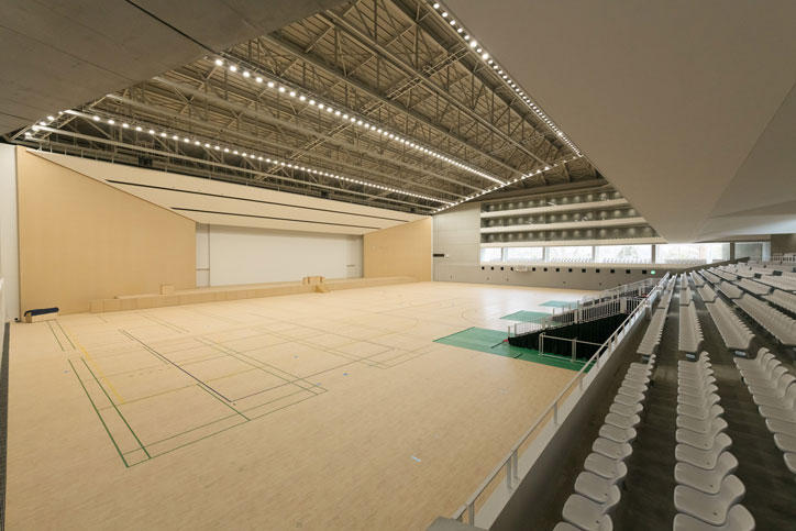 新記念館は、地上4階・地下2階建て、高さは25.8mで、延床面積は約6,000平方メートルから約12,500平方メートルへ、最大収容人数は約6,500人から約10,000人へと、より大きな建物に生まれ変わりました。規模もさることながら、車いすの方のための観覧スペースが設けられ、アリーナに空調機が設置されるなど、利用者にとってより快適な空間となるように配慮されています。今後式典等のイベントや、体育の授業、その他課外活動で使用される予定です。
