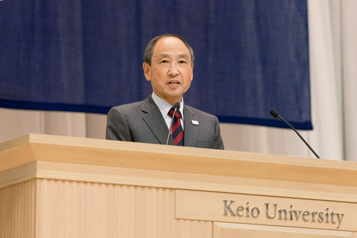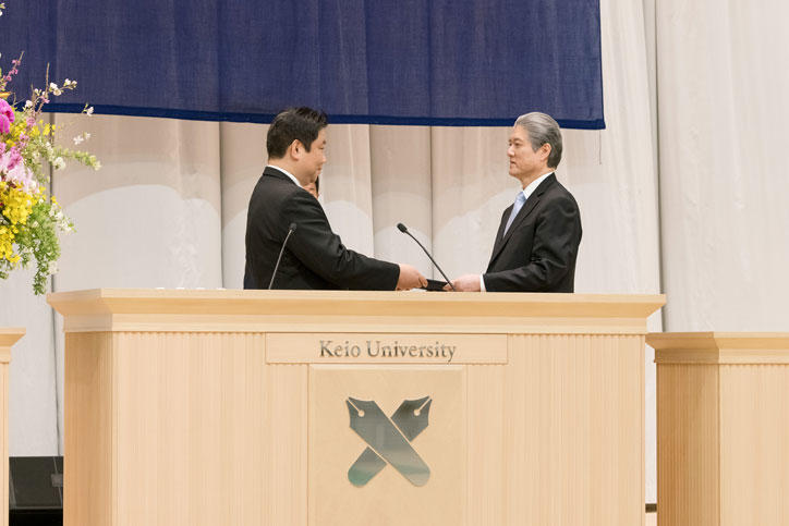 式は、塾歌斉唱に始まり、青山藤詞郎常任理事による学事報告のあと、長谷山塾長からの学位記授与、表彰状授与、また卒業生への激励を込めた塾長式辞がありました。式辞で長谷山塾長は、新型コロナウイルス感染症等の地球規模の課題に対して、世界が協調して対応しようとする動きを象徴するキーワードとしてSDGs(持続可能な開発目標)に触れ、混乱した状況においても不確かな情報に惑わされず、ものごとの本質を見極め、解決法を生み出すことの大切さを述べました。