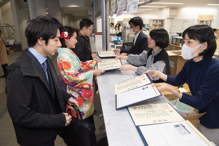 今春は、10学部合計6,224名(うち通信教育課程206名)の卒業生が新たな門出を迎えました。各キャンパスでは、教室等でそれぞれ受け取った学位記を手に、友人らと記念撮影をして談笑する卒業生の姿が見られました。開花を迎えた桜がその様子に彩りを添えていました。