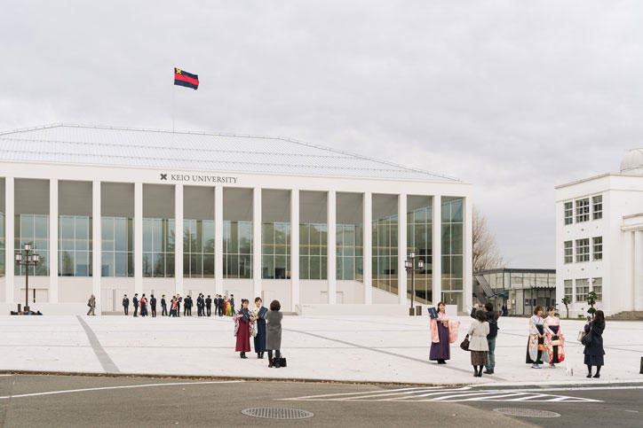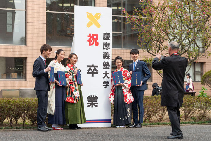 新型コロナウイルスの感染状況をふまえ中止となった2019年度大学学部卒業式に代わり、3月23日(月)、新・日吉記念館にて大学学部学位記授与式が卒業生の参加なしに行われ、慶應義塾ウェブサイトから動画配信を行いました。