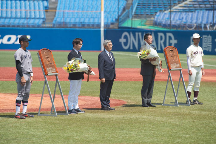 試合に先立ち、今年野球殿堂入りを果たした慶應義塾野球部元監督・故前田祐吉氏と早稲田大学野球部監督・故石井連藏氏の殿堂入り表彰式が行われ、伝統の一戦に花を添えました。両監督が相まみえた1960年秋の「早慶6連戦」は、今なお名勝負として記憶されています。