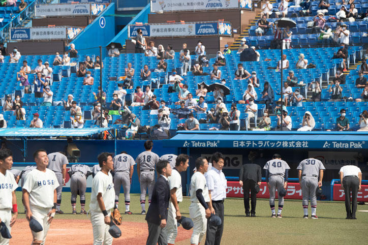 今季リーグ戦は当初4月中旬の開幕が予定されていましたが、延期を重ねながら開催の可能性を探り、時期を8月にずらし、1試合総当たり方式(各校5試合)で行われました。この方式での開催は、戦後直後の1946年春以来74年ぶり5回目のことです。また、観客の収容人数を上限3000人とし、入場前に検温を行う、観戦時はマスク着用のうえ大声を出さない、応援歌を歌わないといった感染症対策がとられました。