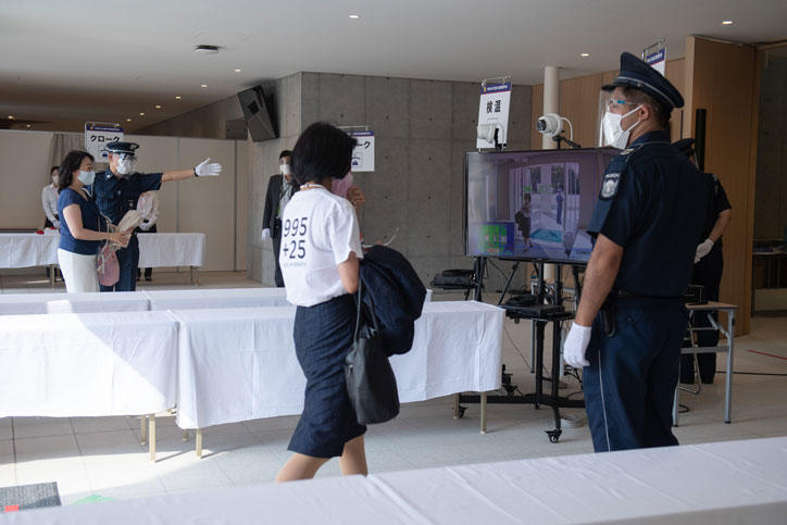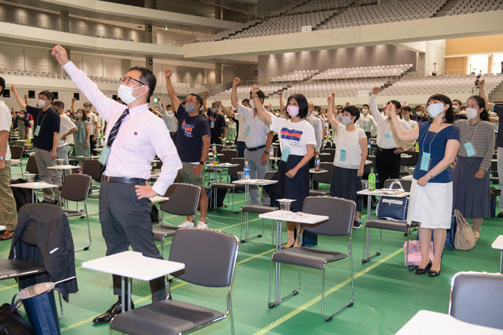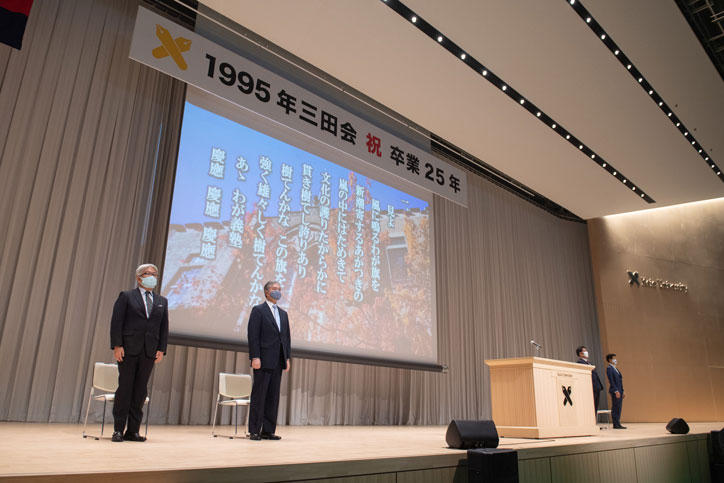 当日は快晴に恵まれ、見学会は入館時の検温、手指の消毒に加えて、ソーシャルディスタンスを確保した座席配置等の感染防止策を講じたうえで開催され、約300名が出席しました。塾歌のCD演奏から始まり、長谷山彰塾長および駒村圭吾常任理事の挨拶、三田貴良1995年三田会代表による挨拶と続き、本年3月の学位記授与式、記念館建設工事記録の動画なども映写されました。最後は、島田豪1995年三田会卒業25年記念事業委員長の挨拶の後、若き血の演奏を聴いて閉会となりました。
