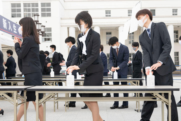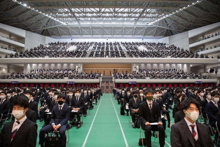 新型コロナウイルスの感染拡大防止に最大限配慮するため、入学式は参加者を新入生と一部の関係者に限り、午前の部・午後の部の2部制で開催、インターネットでのライブ配信も行いました。