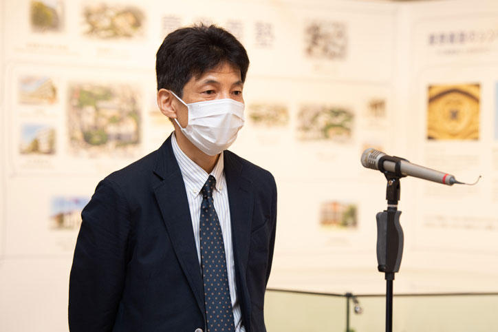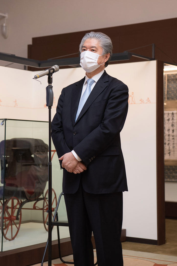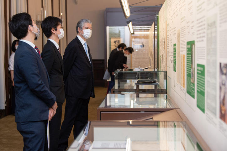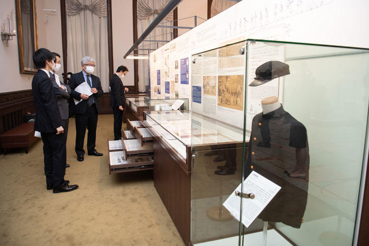 慶應義塾史展示館は福澤先生ウェーランド経済書講述記念日である5月15日の開館を予定していましたが、新型コロナウイルス感染拡大の状況をふまえ、開館を延期することとなりました。そのため、当初の開館予定日であった5月15日に、長谷山彰塾長、慶應義塾史展示館館長を務める平野隆商学部教授などごく限られた関係者のみで「完成式」を執り行い、慶應義塾史展示館の完成を祝いました。