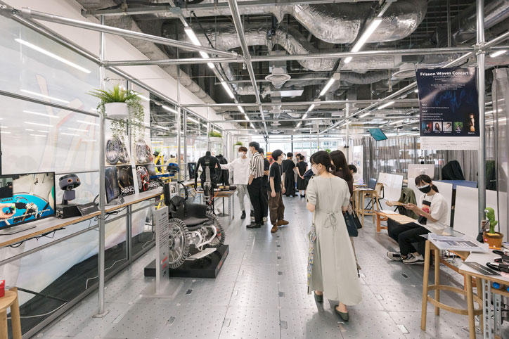 竹芝のオフライン会場ではKMDのカリキュラムの中核をなすリアルプロジェクトの体験型展示が実施されました。オンライン会場では、Walt Disney Imagineeringに長年勤めたMK Haley 氏による『過去の事例から考えるテーマパークの未来』(MC:KMD委員長 稲蔭 正彦)や、近未来のオタク活動をテーマに、杉浦一徳(KMD教授)、中村仁(跡見学園女子大学准教授)、小栗徳丸(世界コスプレサミット実行委員会実行委員長)による『The Future of Otaku』、各国からKMDに来ている留学生や卒業生によるKMDの座談会『KMD 生ってどんなことしているの?』、KMD修了生による『LIFE after KMD』等が配信されました。