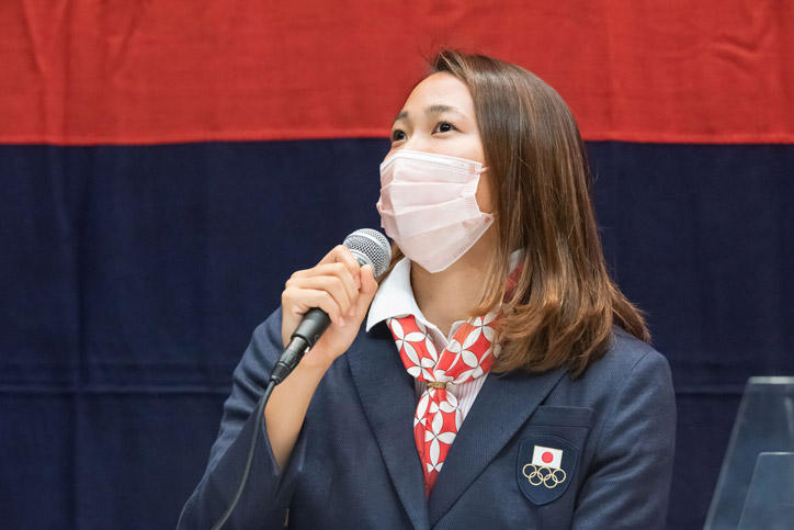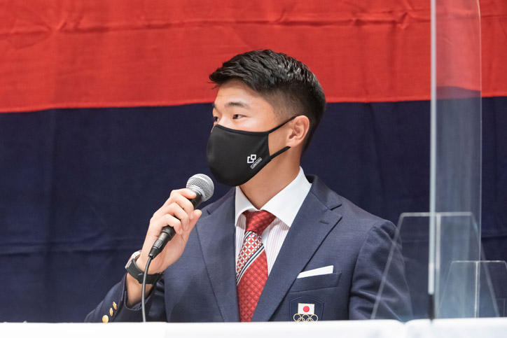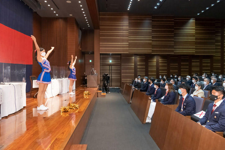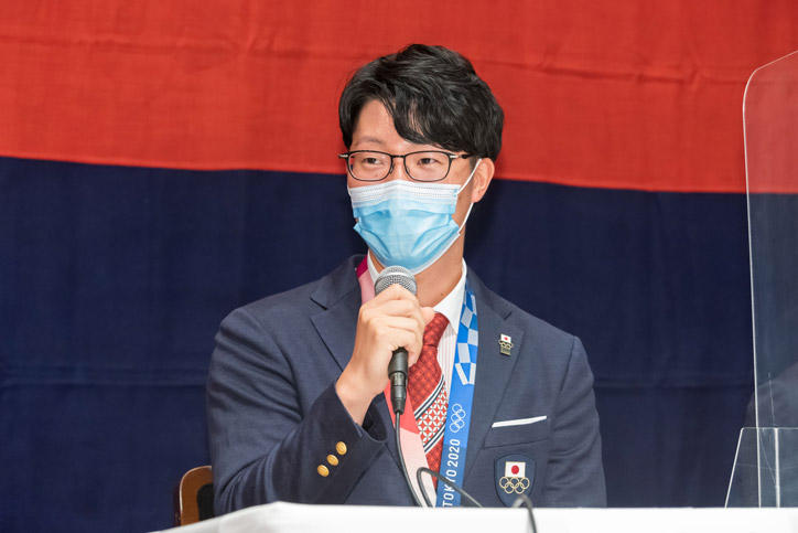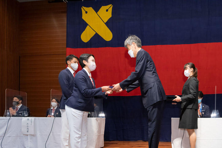 今夏に開催された東京2020オリンピックおよびパラリンピックには、慶應義塾大学の塾生(学生)、塾員(卒業生)が計10名出場し、それぞれの種目で活躍しました。各選手の健闘をたたえるために、9月28日(火)、三田キャンパス南校舎ホールにて「東京2020オリンピック・パラリンピック出場選手塾長招待会」が開催されました。本会は、新型コロナウイルスの感染拡大防止に最大限配慮するため、参加者を選手と一部の関係者に限り、インターネットでのライブ配信を行いました。