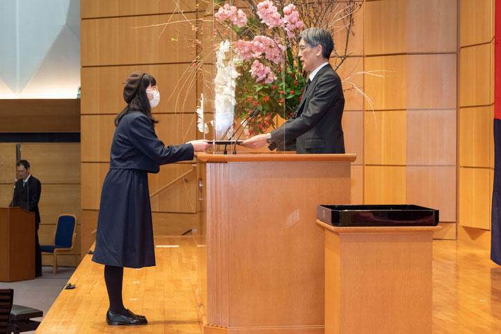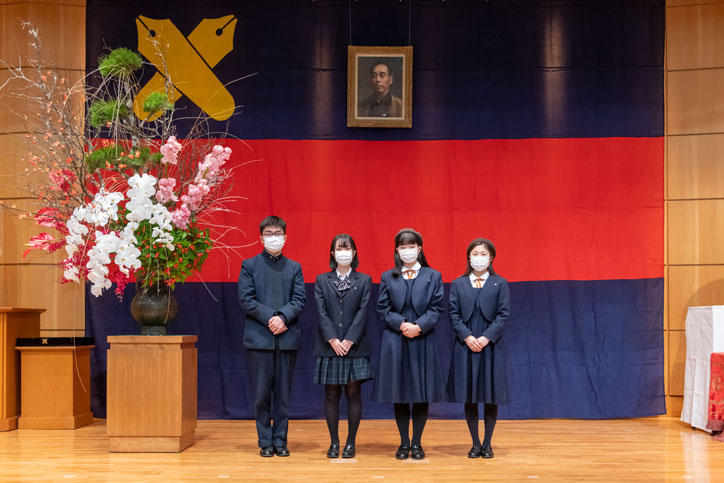 1月10日(月)に開催された第187回福澤先生誕生記念会で、第46回小泉信三賞全国高校生小論文コンテストの表彰が行われ、受賞者には伊藤公平塾長から賞状が授与されました(武島花梨君は都合により欠席)。続いて審査委員を代表し、株式会社早川書房代表取締役社長の早川浩委員より、講評が述べられました。記念会終了後には、受賞者を囲んで審査委員など関係者による恒例の懇親会が催されました。新型コロナウイルス感染防止のため、参加者は全員マスクを着用し、距離をとったうえでの懇談となりましたが、大学で学びたいことや小論文を書こうと思ったきっかけなど、審査委員と受賞者が直接交流できる貴重な機会となりました。