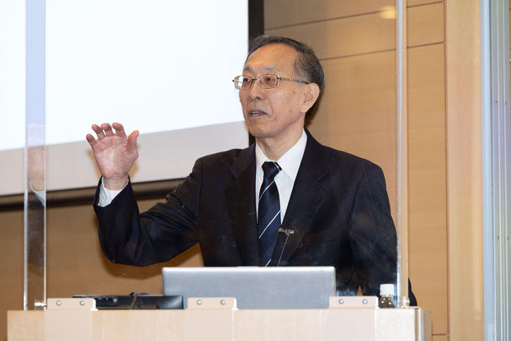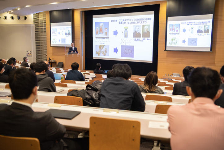講演では、プロスタグランジンという生理活性脂質を巡る一企業の採ってきた研究開発の歴史を振り返りながら、経験の深化と統合から新しい仮説や価値を生み出すプロセスの重要性を語られました。また、科学技術革新から発見、創薬へとつながる研究プロセスの中で、アカデミアとの連携、オープンイノベーションの重要性について、脂質メディエーター創薬や、がん免疫チェックポイント創薬などの具体例を挙げられ、新しい価値の創造に至るリアルな現場感覚あふれるお話をいただきました。日本の企業は改良型の方策には秀でているが、一方でイノベーションを起こすような新規テーマには躊躇しているという意見がある中で、これまでの製薬企業での経験から記憶に値する事例を単純化・抽象化することで、次世代に向けたレガシーの伝承、および創薬イノベーションの将来像の提起を試みられた本講演は、薬学関係者のみならず幅広い分野に対して大変示唆に富む、深みのある内容でした。