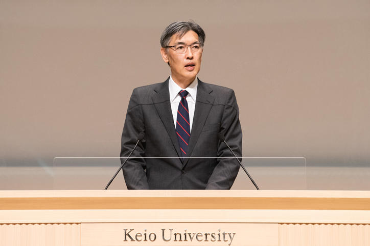 式は松浦良充常任理事による学事報告に始まり、続いて伊藤公平塾長から式辞が述べられました。塾長は、「高度な専門性」・「豊かな教養と俯瞰力」・「世界レベルで社会の流れを読む力」を磨きあげ、学問という万国共通の興味を駆使して、この先50年の社会の発展に、世界中の人と手を取り合って貢献して欲しいと語りました。