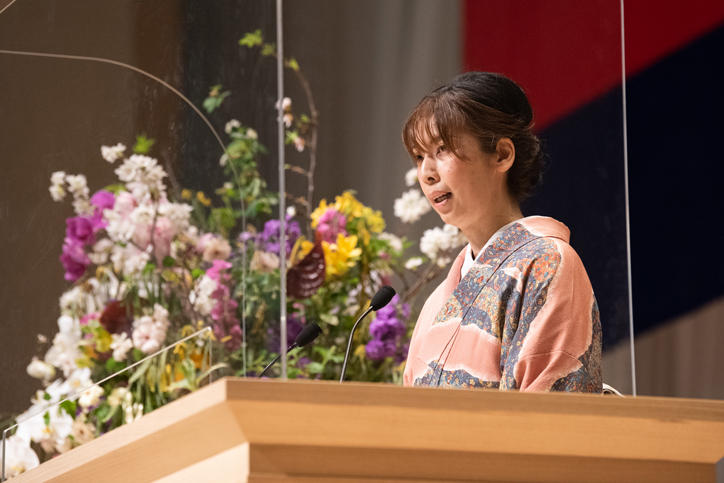 続く教職員代表祝辞では、東海林祐子政策・メディア研究科准教授が、「自分の評価や存在価値」だけにとらわれず、「自分がつくりたい未来はどういうものか」という内なる信念に基づいて研究に励み、社会に貢献して欲しいと語りました。