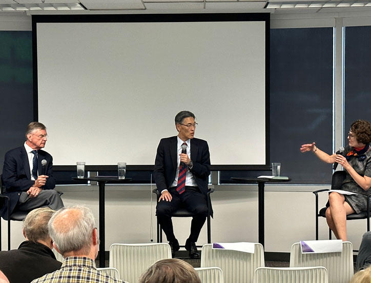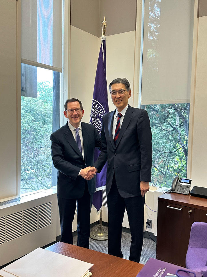 ■伊藤塾長、Northwestern大学で講演2023年9月11日に伊藤塾長、土屋常任理事がNorthwestern Universityを訪問しました。伊藤塾長はNorthwestern Roberta Buffett Institute for Global Affairs において、“State-of-the-art Applications of Quantum Computing”と題した講演を行い、慶應義塾大学の量子コンピューターのアルゴリズムやソフトウェア研究などを紹介し、科学・産業分野における量子コンピューターの将来の展望などについて議論しました。また、講演の前には伊藤塾長と土屋常任理事が、従来から経営管理研究科と交流のある同大学のKellogg School of Managementを訪問、また、Feinberg School of Medicineの研究者等と面会し、Michael Schill学長とも面会して、今後の両大学のより広い交流について懇談しました。