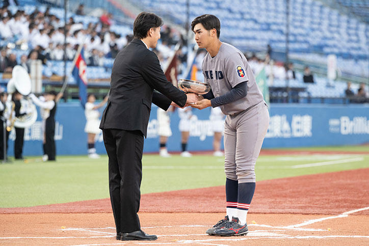 今季は、栗林泰三君(環境情報学部4年・外野手)が三冠王を獲得し、さらに栗林君と外丸東眞君(環境情報学部2年・投手)と宮崎恭輔君(環境情報学部4年・捕手 )の3名がベストナインに選ばれ、輝かしい記録を残しました。