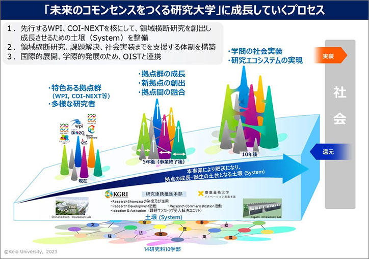 慶應義塾大学では、私立大学として唯一のWPI拠点およびCOI-NEXT本格型2拠点を有します。これらの特色ある拠点群を発展させ、更に智徳の協働で多様な研究拠点を生み出し育む「土壌」を醸成し、課題解決から社会実装までを支援する体制を構築します。それにより学問、特に実学の成果を「未来のコモンセンス」として成就させるエコシステムを確立する研究大学になるべく、取り組みを進めてまいります。