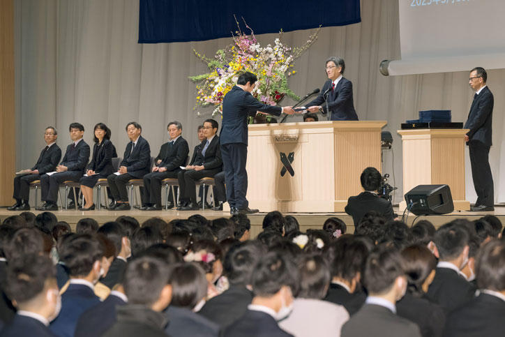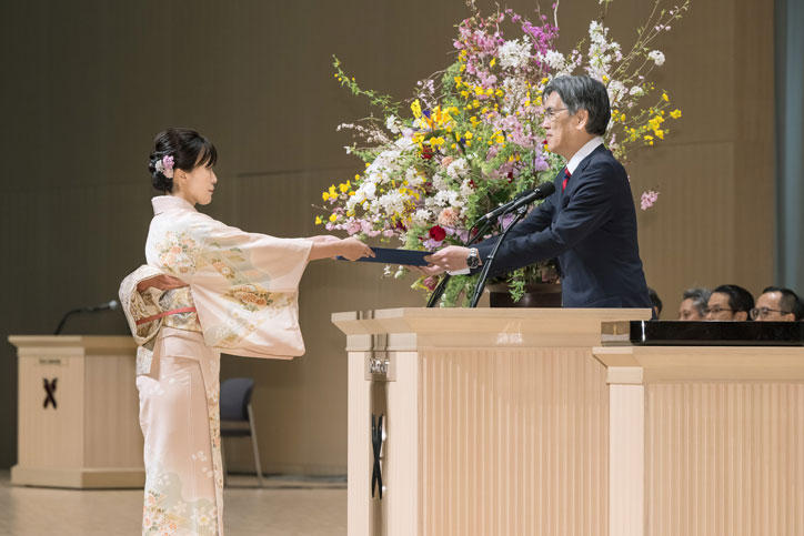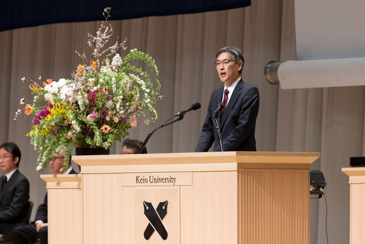 式は塾歌合唱に始まり、松浦良充常任理事による学事報告のあと、伊藤公平塾長から学位記授与、表彰状授与、そして式辞がありました。塾長は、卒業生に贈る言葉として「コモンセンス(common sense)」を選び、「現在のコモンセンスに基づき、取り組むべきことを実行すること」「将来のコモンセンスを作っていくこと」を通して、卒業生が世界の舞台で社会の発展に寄与してほしいと式辞で伝えました。