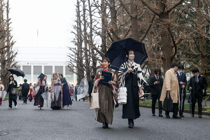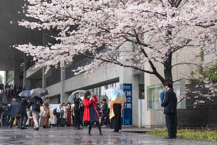 両日とも桜雨の下、日吉キャンパスには多くの卒業生・修了生たちの笑顔が咲きました。