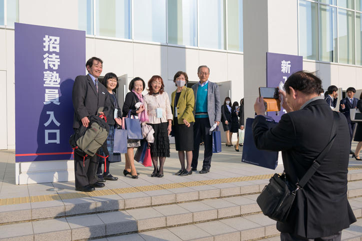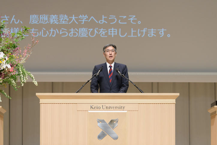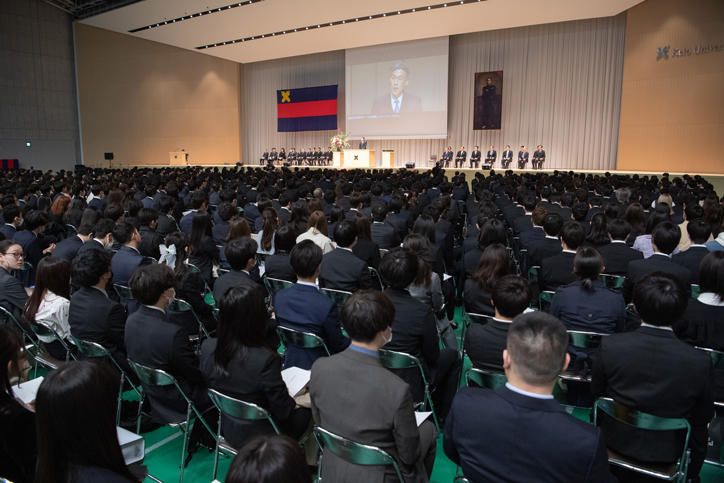 式は2部制で開催され、午前の部には、法学部、商学部、理工学部、別科・日本語研修課程の新入生が、午後の部には、文学部、経済学部、医学部、総合政策学部、環境情報学部、看護医療学部、薬学部の新入生が参列しました。また、式には卒業後50年となる塾員が招待され、式典の最後に1973年(昭和48年)年三田会から寄附目録の贈呈とご挨拶がありました。