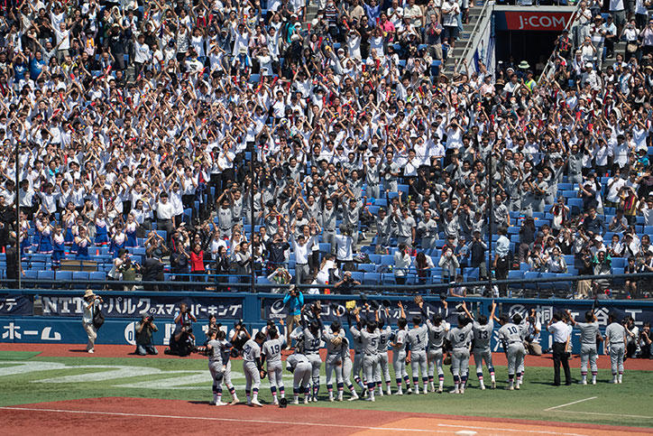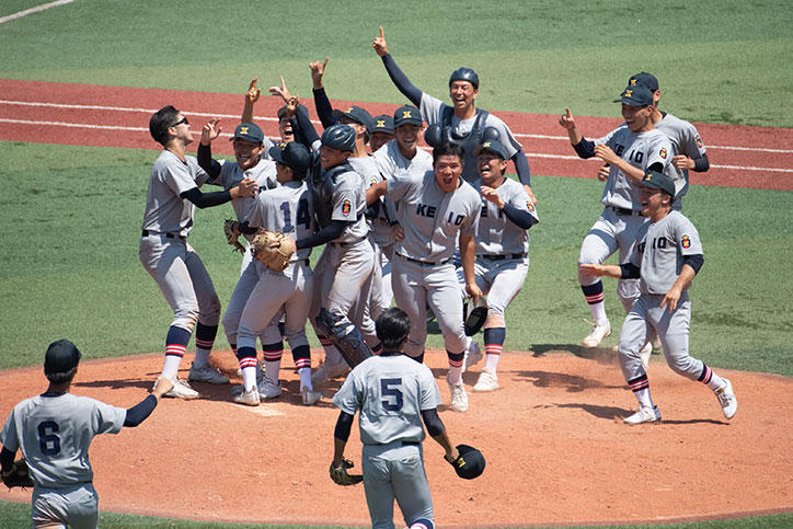 3回表に2点先制した慶應義塾高校は、5回裏に1点差に追い上げられ、6回表に追加点をあげますが、6回裏に3失点を喫し逆転を許しました。7回裏にも追加点を許し3対5のまま迎えた9回表、渡邉千之亮君による劇的な3ランホームランで逆転。投げては先発小宅君から鈴木君、松井君への継投で横浜高校打線を抑え、ピンチの場面でも笑顔のエンジョイ・ベースボールで見事勝利をつかみました。スタジアムでは、記録的な猛暑のなか野球部員や在校生、卒業生をはじめとする多くの観客が声援を送り、野球部の勝利と、今春のセンバツに続く甲子園出場の喜びを分かち合いました。夏の甲子園でセンバツでの雪辱を果たす活躍が期待されます。