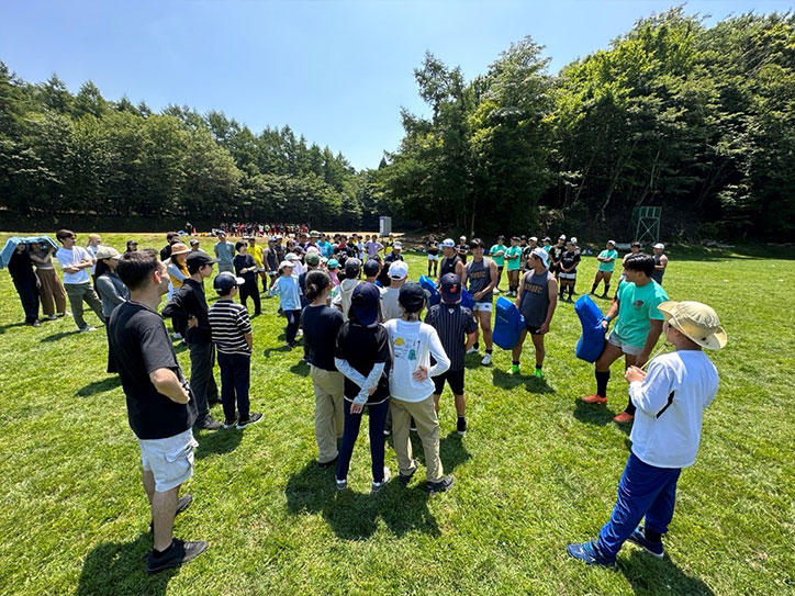 また、山中山荘では同時期に合宿をしていた高等学校蹴球部(ラグビー部)とのラグビーによる交流も行いました。慶應義塾の特徴のひとつである一貫教育や経験・知識の多様性を活かした取り組みであり、プログラムの実施前後でX-shipに関するアンケートや観察、振り返り対話などを行い、その有効性を確認しました。