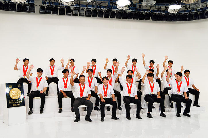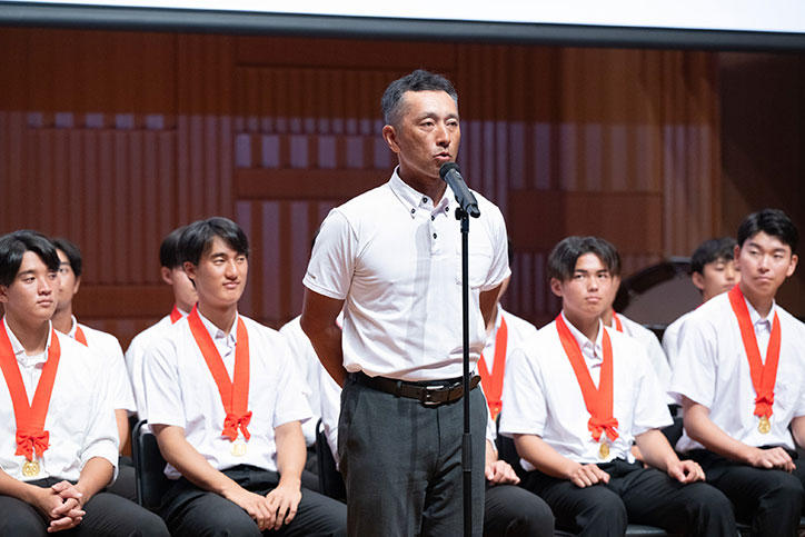 森林監督は「たくさん『ありがとう、おめでとう』と声をかけてもらったが、その言葉は皆様へそのままお返ししたい」と話し、赤松衡樹部長は「チーム全員で勝ち取った優勝、本当に多くの応援があってこそ」、大村主将は「こんなに幸せな高校球児はいない」と感謝とお礼を述べました。