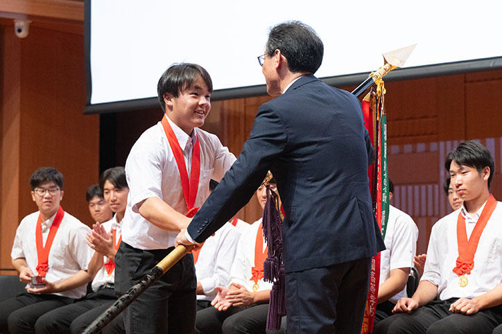 9月2日(土)には日吉倶楽部(高等学校野球部OB会)主催の優勝報告会が日吉キャンパスで開催され、大村昊澄主将から阿久澤武史校長へ優勝旗が授受されました。阿久澤校長は「決勝で戦った仙台育英をはじめ、神奈川のチーム、全国のライバルチームをリスペクトするように。また、学生の本分を忘れないように勉強をし、様々な経験をして人間としての幅を広げて欲しい」と野球部員にエールを送りました。義塾関係者が多く集い、伊藤塾長からのビデオメッセージのほか、来賓の方々から祝辞をいただきました。