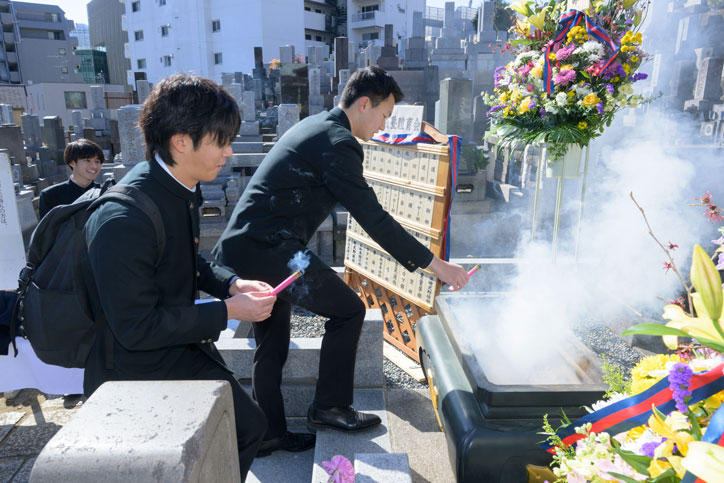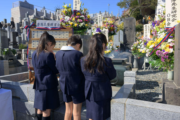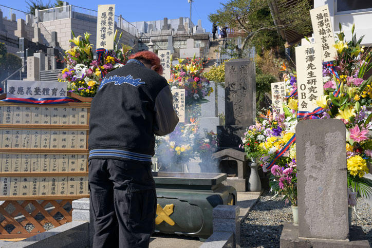 福澤諭吉先生のご命日である2月3日(土)、麻布山善福寺(港区元麻布)において124回忌の法要が行われました。快晴の中、墓前には家族とともに訪れた一貫教育校生の他、塾生、卒業生、教職員など多くの義塾関係者が訪れ、手を合わせました。