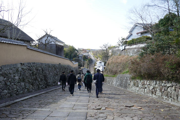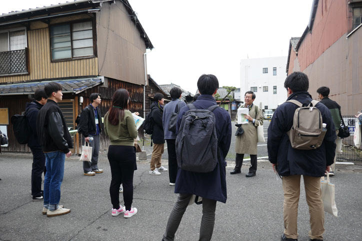 大分県・中津市の関係者の方にお出迎えいただき、福澤諭吉旧居・福澤記念館から出発したツアーでは、古地図を持って江戸時代の町割りが残る中津の町を散策し、当時と同じ道幅や町の構造から福澤先生が生きた中津を体験しました。城下町の東側に位置する外堀に沿って寺院が集中している寺町周辺の様々な寺院、商家や醸造業が集まった当時の趣を残す建造物がある諸町の街並み、福澤の又従兄ながら福澤の暗殺を企んだ増田宗太郎生誕の地などの史跡を巡り、時に笑い話も交えた解説を聞きながら散策を楽しみました。
