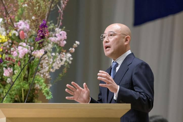 その後、塾員代表の楽天グループ株式会社チーフウェルビーイングオフィサーで慶應義塾評議員の小林正忠君からの祝辞に続き、卒業生を代表して経済学部4年の鄭怡然君が答辞を述べました。