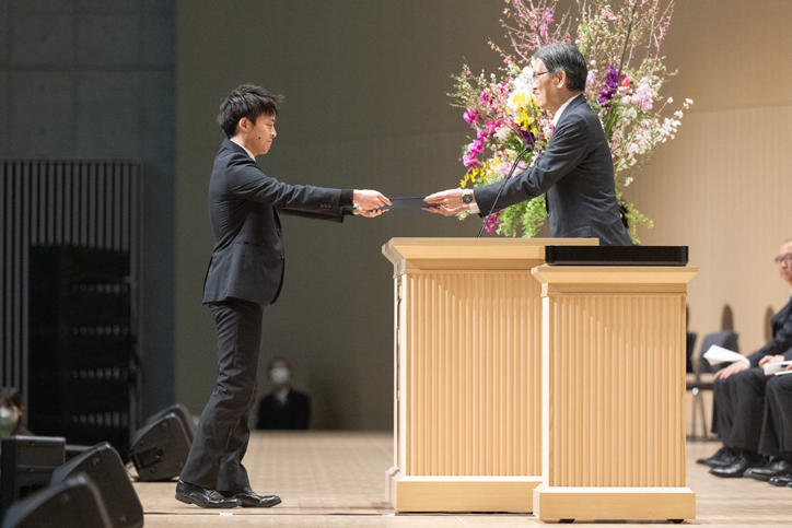 式は、松浦常任理事の学事報告に始まり、塾長から博士・修士・専門職学位それぞれの代表3名に対して学位記が授与されました。塾長の式辞に続き、当麻哲哉システムデザイン・マネジメント研究科教授が教職員を代表して祝辞を述べ、最後は塾歌斉唱で締めくくられました。
