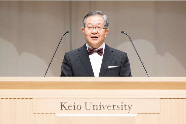 式は、松浦良充常任理事による学事報告に始まり、伊藤公平塾長から学位記授与、表彰状授与の後、式辞が贈られました。式辞で伊藤塾長は、ダボス会議における米国人ジャーナリストのトーマス・フリードマン氏との会話を紹介しました。フリードマン氏は、海と陸の緩衝地帯であるマングローブが人間の経済活動によって破壊されていることに絡め、政治と国民の間に入る情報のマングローブ(浄化媒体であり緩衝地帯)たるメディアがSNSの台頭により役目を果たせなくなっていることへの危機感を示しました。この話を踏まえ、伊藤塾長は卒業生に対して、「人間(じんかん)交際」を大切にした福澤先生のように、さまざまな世間や社会制度を有機的に繋げて社会を発展させる独立自尊の先導者になってほしいと語りかけました。
