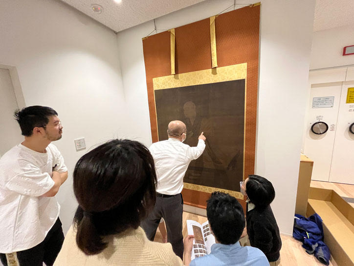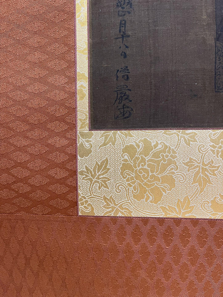 修復作業は、2022年から2023年にかけての2年間にわたり東京文化財研究所内で行われました。今回の修復は、掛け軸を一度解体し、新たに絹を補填したところは、補われる絹(補絹)を鎌倉時代の絹に沿うよう劣化させ、補填した箇所が分かりかつ、鑑賞を損なわない程度に補彩しました。黒い肌裏紙*(はだうらがみ)を取り除き新しくし、長年の保存でおれぐせがあった箇所は、裏面に2mmくらいの幅の紙を補いました。また、表装裂*(ひょうそうぎれ)も新調し、「茜」 (あかね)や「阿仙」(あせん)を使った草木染でオレンジがかったものを選びました。