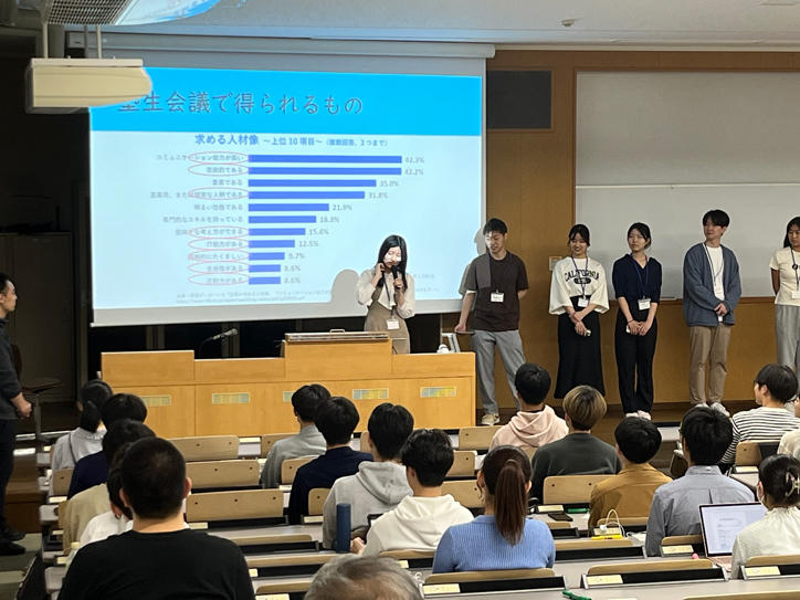 グループワークでは参加メンバー同士で参加理由や塾生会議で実現したいことを共有し合いました。塾生会議に教員として携わる法学部の土居志織専任講師、商学部の森吉直子教授、医学部の寺沢和洋助教、スポーツ医学研究センターの小熊祐子教授、最後に岡田英史常任理事からの挨拶と激励があり、2050年の未来の姿を見据えた最終提言に向けて士気を高めました。