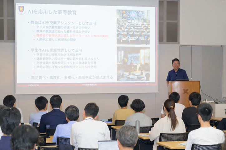 はじめに、伊藤塾長より慶應義塾大学とカーネギーメロン大学(CMU)と最先端AI研究に関する新たな研究パートナーシップを結んだことが紹介されました。続いて、矢向高弘(システムデザイン・マネジメント研究科教授)から、AIを応用した高等教育の実践についての説明がありました。