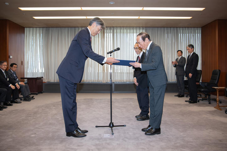 7月3日に日本銀行本店で日本銀行券の贈呈式が行われ、植田和男総裁から伊藤公平塾長へ、一万円札の最終製造券が贈呈されました。慶應義塾は創立者・福澤諭吉の肖像が印刷された1984年、2004年発行の一万円札2号券を日本銀行より贈呈されています。植田総裁は、これまで長きにわたり慶應義塾が2号券の記念展示を行うなど銀行券広報に協力してきたことへの謝意を表され、2004年発行一万円券の最終製造ロットにあたる「ZE300000X」の記番号券を伊藤塾長に手渡しました。