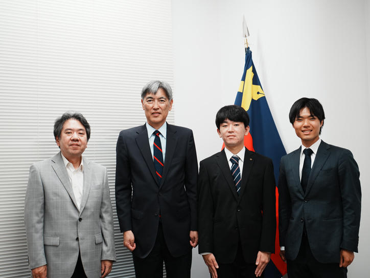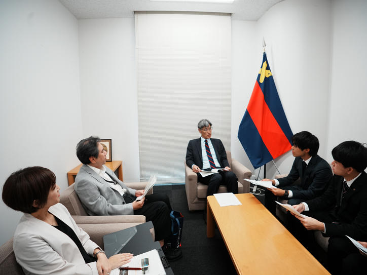 全塾協議会とは、塾生の福利厚生の向上を目的とした学生自治組織であり、塾生代表は立候補者の中から選挙によって選ばれます。今回の訪問は、岩切太志君が塾生代表に就任したことを受けて行われたもので、全塾協議会の在り方や今後の活動について意見が交わされました。