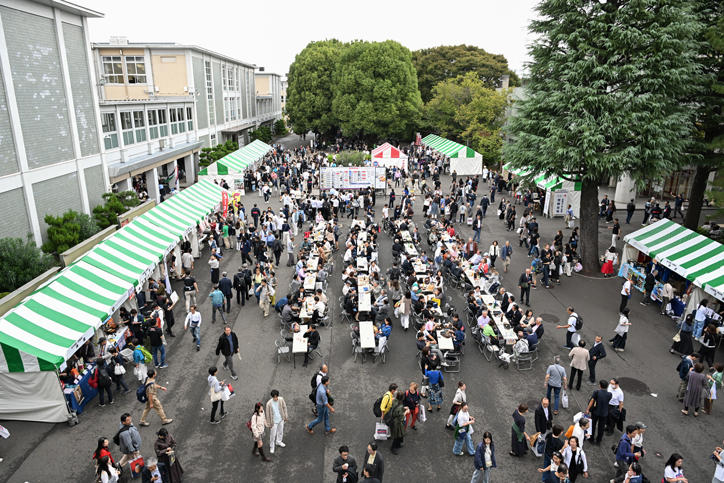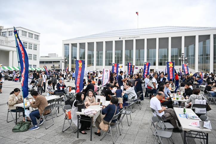 10月19日、日吉キャンパスにて2025年慶應連合三田会大会が開催されました。本大会は、慶應義塾の塾員(卒業生)やその家族の「義塾社中」が一堂に会する年に一度のホームカミングディで、約16,000人が日吉の丘に集まりました。本年のスローガンは「集え三色旗の下に」。デジタル化が加速する今だからこそ、直接語り合う機会に重きを置いて “リアル”に集い、世代を超えて交流する場になってほしいという願いがこめられています。