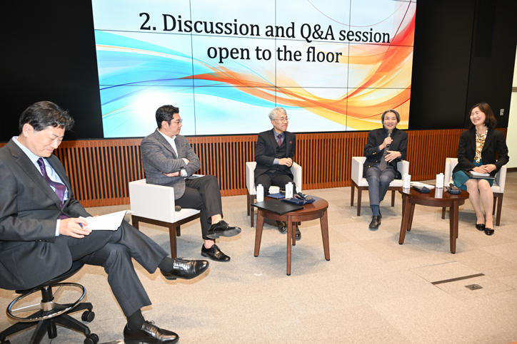 続くパネルディスカッションには、延世大学からHye Joon Yoon教授(Department of English)、Nam Ju Kim准教授(Department of Education)、本学からは徳永聡子文学部教授、石井明経済学部教授が登壇し、AIにより情報が氾濫し、情報を容易に獲得できる環境に置かれている今日の学生への向き合い方や、好奇心を持つこと、実体験を積むこと、答えのない人間社会の本質的な問いに対し議論を重ねていくことの重要性など、「人間とは何か」について、教育者、専門家の立場から討論が繰り広げられました。