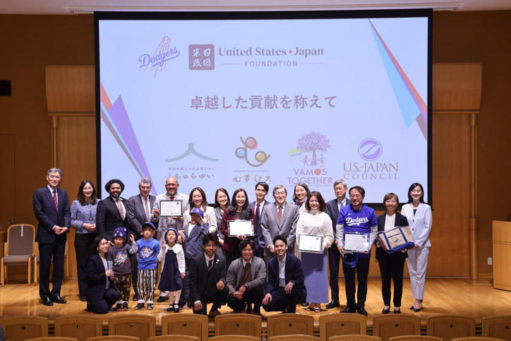 本イベントと併せて、ロサンゼルス・ドジャースと米日財団による助成金進呈式も実施されました。米日財団で伊藤塾長が副理事長を、ロサンゼルス・ドジャース社長兼CEOのスタン・カステン氏が理事を務めている縁で、子ども支援事業に携わる4団体への助成金の進呈が行われることになりました。助成を受けたのは、沖縄青少年自立援助センターちゅらゆい、全国こども食堂支援センター・むすびえ、VAMOS TOGETHER、米日カウンシル-ジャパンの4団体です。本助成に関連し、佐藤さんよりドジャースの社会貢献活動の例として、大谷翔平選手による重い心臓病の子どもへのサプライズや、山本由伸選手による子どもたちへの読み聞かせの様子が映像とともに紹介されました。