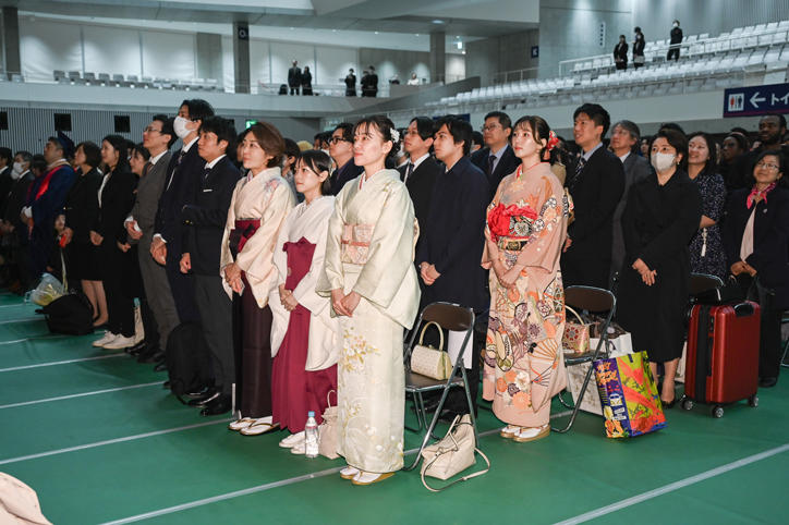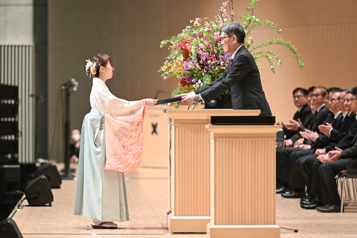 また午後に行われた大学学部卒業式は、塾歌斉唱に始まり、松浦常任理事による学事報告、伊藤塾長から学位記授与、表彰状授与の後、式辞が述べられました。伊藤塾長は式辞で「慶應義塾の目的」や『学問のすゝめ』を引用しつつ、独立自尊の先導者としてそれぞれの立場で社会をより良くする役割を果たしてほしいこと、また慶應義塾大学で身につけた学び続ける力をもって、生涯を通して学び続けてほしいことを卒業生に伝えました。