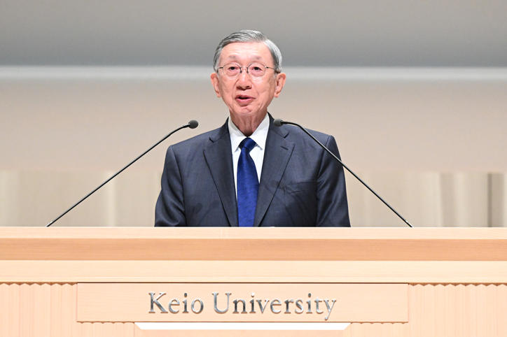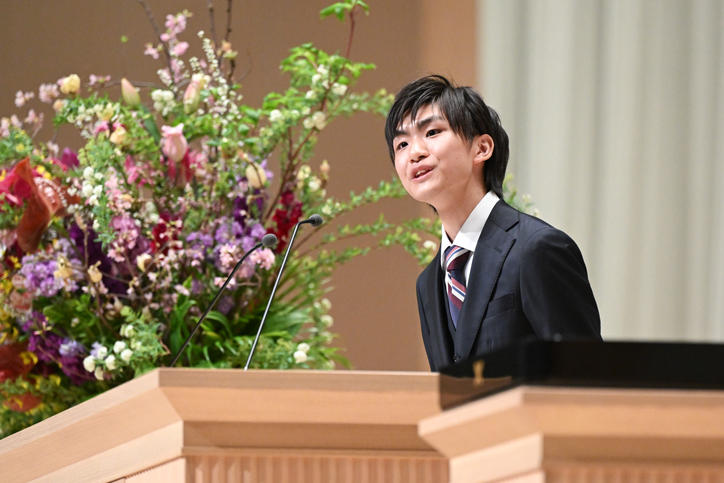 その後、塾員を代表して日清食品ホールディングス株式会社代表取締役社長・CEOで慶應義塾評議員の安藤宏基君による祝辞、続いて卒業生を代表して法学部4年の大槻凜君が答辞を述べました。