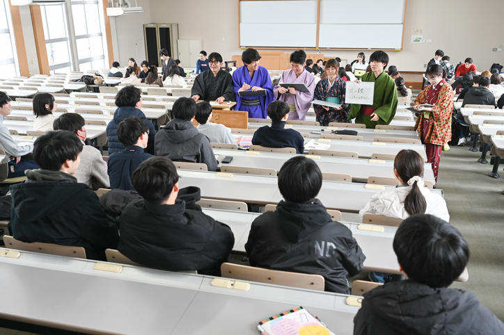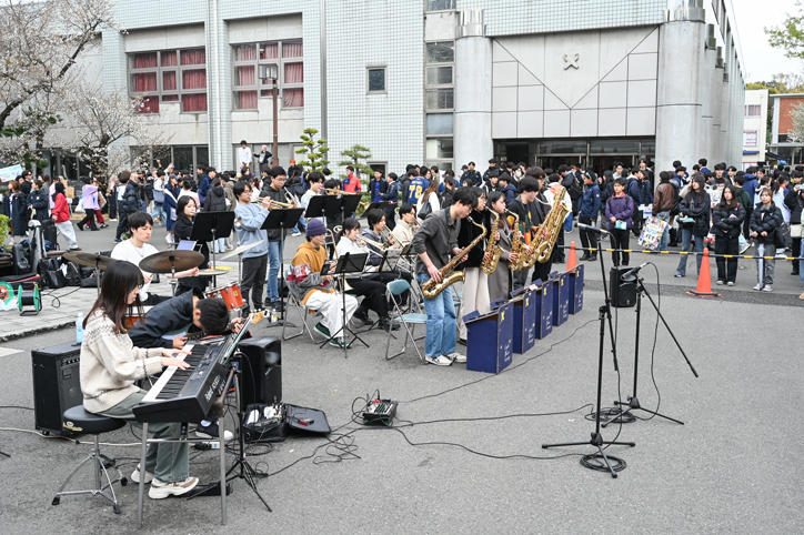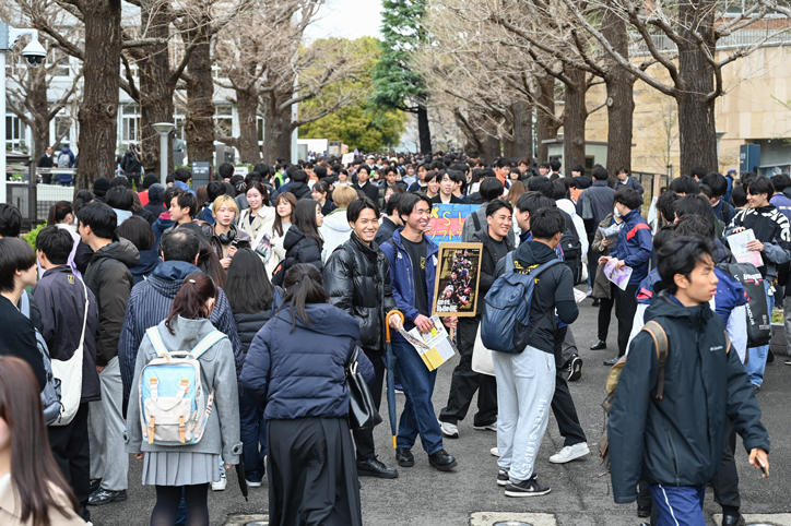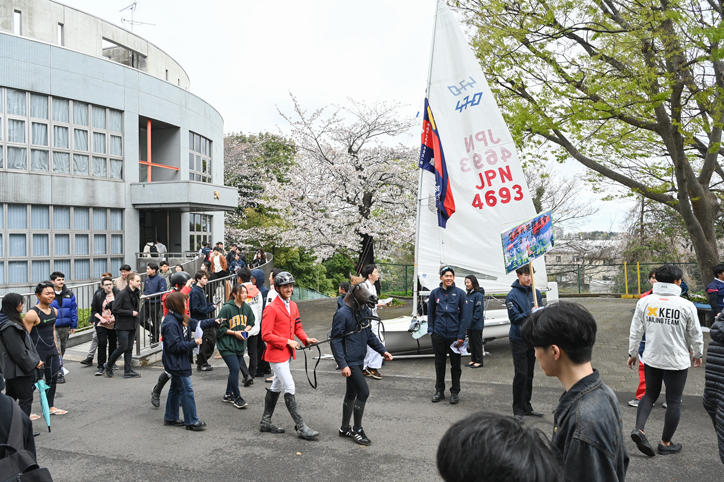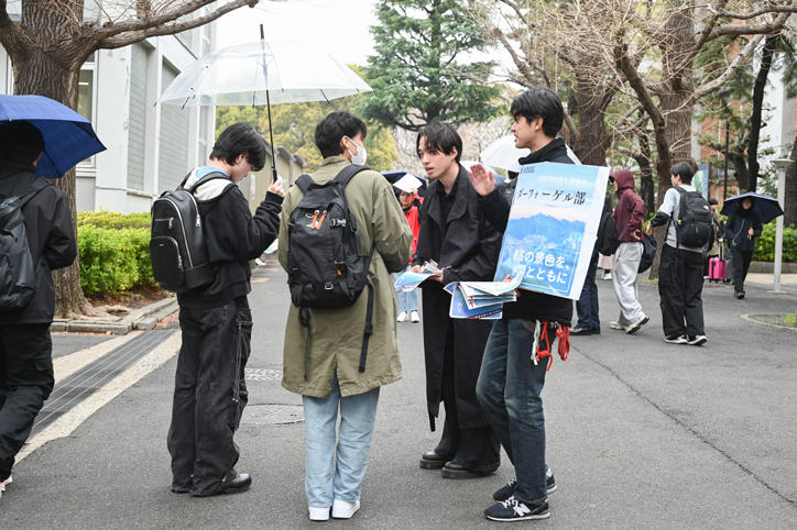 オリエンテーション期間の日吉キャンパスでは、さまざまな学生団体による新入生の勧誘やステージイベントが行われています。あいにくの天気が続いていますが、満開の桜の下、日吉キャンパスは、多くの新入生らで賑わいをみせ、活気に満ちています。(撮影日:2025年4月2日)