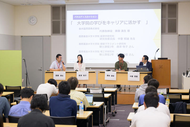続いて、斎藤氏に中妻照雄経済学研究科委員長、Keio-SPRINGプロジェクト採択学生2名を交え、「大学院の学びをキャリアに活かす」をテーマにパネルディスカッションが行われました。各登壇者のそれぞれの経験から、アカデミア以外のフィールドでのキャリアに関する興味深いディスカッションとなり、参加した学生からも多様な質問がなされるなど、対面・オンライン双方で参加した学生にとって刺激的な議論の場となりました。