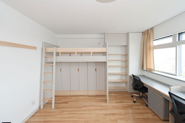 2017年開設。日本人学生2人、留学生2人の4人で1ユニットの国際学生寮で、共用キッチンや集会室など交流スペースも豊富です。